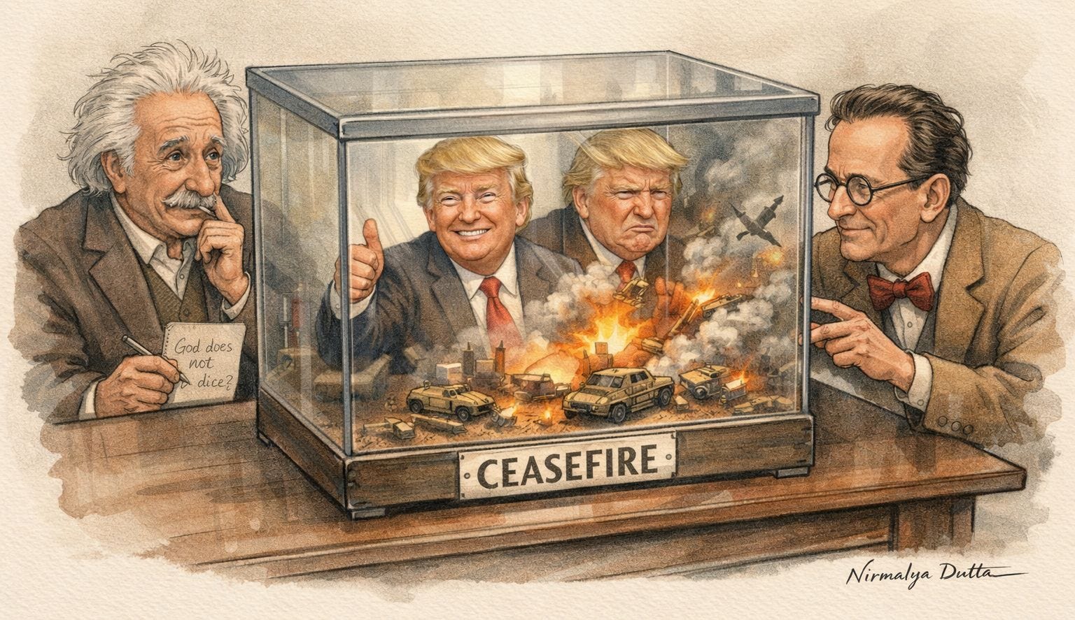 Back in the day, Einstein, the greatest mind of all time, could never make peace with the uncertainty, contradiction, and probabilities of quantum mechanics, insisting God doesn’t play dice. But if he were alive today, the great pacifist would have been tormented by the war wrought by men playing dice, where a ceasefire is both declared and denied, where multiple versions of the truth exist at the same time, where the war is both paused and un-paused, refusing to collapse into a single, observable truth.