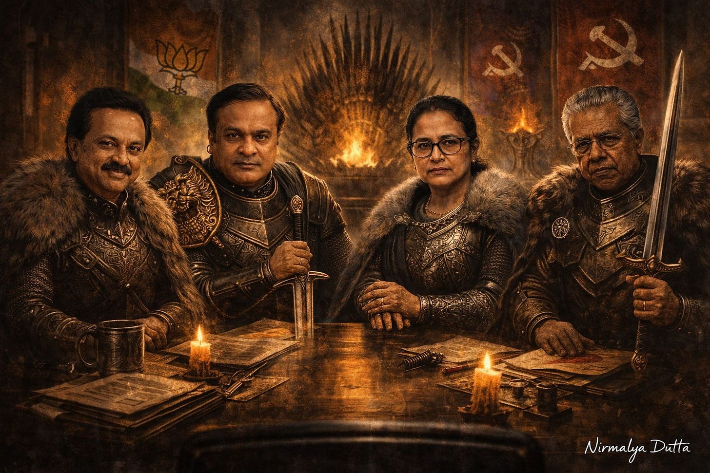 In Tamil Nadu, the battle is between the DMK-led Secular Progressive Alliance (SPA) and the NDA, which is led by the AIADMK in the state. A third wheel is Vijay’s TVK, and frankly, all I know is that he’s a great dancer with unmatched charisma based on the one Vijay movie I’ve watched so far: Master. But “Vaathi Coming” is a remarkable beat, and Vijay’s party flag looks a lot like Spain’s.